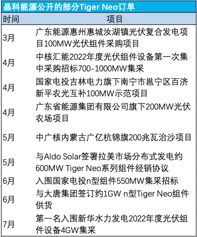 產(chǎn)能不斷攀升的同時,晶科能源主推的n型Tiger Neo系列組件在市場上斬獲大量訂單,大大加速了TOPCon產(chǎn)業(yè)化進程。晶科能源公開的部分Tiger Neo訂單包括:
