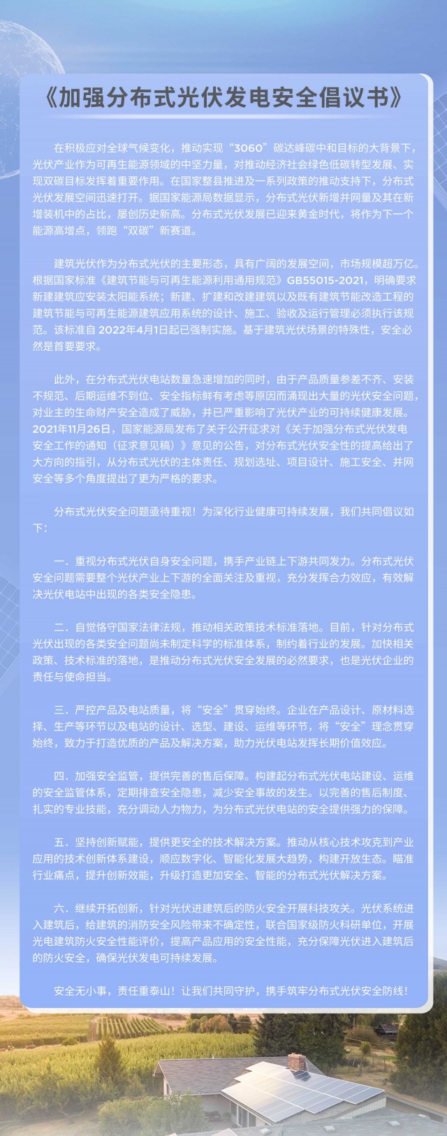 前不久,昱能科技聯(lián)合中國建筑科學(xué)研究院防火研究所、華為數(shù)字能源、優(yōu)得運維、固德威、史陶比爾、杭州龍焱、武漢日新等8家單位,共同發(fā)起了行業(yè)首個關(guān)于分布式光伏發(fā)電安全倡議及發(fā)布了《加強分布式光伏發(fā)電安全倡議書》,號召行業(yè)聚焦光伏安全問題。從《倡議書》內(nèi)容看,除了強調(diào)遵守相關(guān)法律法規(guī),重視安全問題以外,還需要光伏企業(yè)在產(chǎn)品設(shè)計、原材料選擇、生產(chǎn)等環(huán)節(jié)以及電站的設(shè)計、選型、建設(shè)、運維等環(huán)節(jié),將“安全”理念貫穿始終,致力于打造優(yōu)質(zhì)的產(chǎn)品及解決方案。