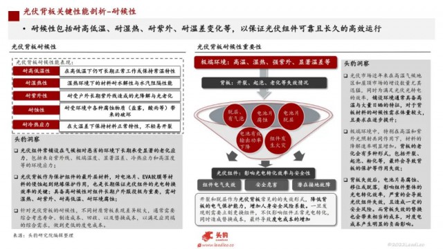 光伏組件常鋪設(shè)在氣候相對(duì)惡劣的環(huán)境下長期承受顯著的老化應(yīng)力,包括來自紫外線、極端溫度、顯著溫差、冷熱應(yīng)力和高濕度等的環(huán)境應(yīng)力;光伏背板作為保護(hù)組件的最外層材料,對(duì)電池片、EVA膠膜等材料的侵蝕起到絕緣保護(hù)作用,也是長期保證光伏組件的光電轉(zhuǎn)換效率的關(guān)鍵;具備高耐候性對(duì)組件長期戶外服役極為重要,需耐濕熱、耐紫外、耐高低溫、耐環(huán)境腐蝕;針對(duì)光伏背板的耐候性,不同材質(zhì)背板表現(xiàn)差異較大,通常需要綜合考慮壽命、制造成本、回收、以及替換成本,以滿足應(yīng)用端的綜合需求,做到更低的度電成本。