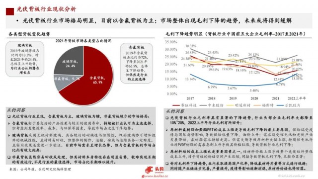 光伏背板廣泛應(yīng)用于太陽能電池(光伏)組件,在國家政策的整體推動(dòng)下,光伏產(chǎn)業(yè)進(jìn)入爆發(fā)式增長階段,同時(shí)將帶動(dòng)背板行業(yè)的快速發(fā)展與規(guī)模擴(kuò)張。目前背板行業(yè)整體呈現(xiàn),含氟背板為主,玻璃背板為輔,非氟背板較少的市場(chǎng)格局。近年光伏背板行業(yè)毛利率具有顯著的下降趨勢(shì),行業(yè)頭部5家企業(yè)最低已降至10%以下,主要由原材料成本上漲導(dǎo)致,企業(yè)積極采取應(yīng)對(duì)措施,趨勢(shì)或?qū)⒌玫骄徑狻?/p>