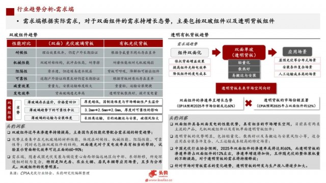 需求端根據(jù)實(shí)際需求,對(duì)于雙面組件的需求持增長態(tài)勢(shì),主要包括雙玻組件以及透明背板組件。