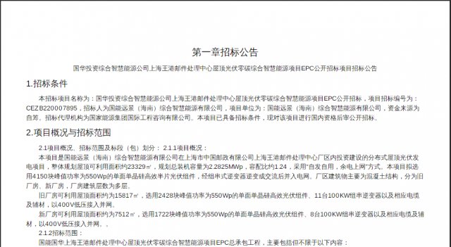 2022年對(duì)于郵件處理中心裝光伏的投資也逐漸火熱。9月13日,上海市中國(guó)郵政有限公司廠區(qū)內(nèi)投資建設(shè)的分布式屋頂光伏發(fā)電項(xiàng)目,明確新舊廠房都要裝光伏!整體規(guī)劃屋頂可利用面積約23329㎡,新、舊廠房可利用屋頂面積分別約為7512㎡、15817㎡,規(guī)劃總裝機(jī)容量2.2825MWp,采用“自發(fā)自用,余電上網(wǎng)"方式。共計(jì)選用4150塊單面單晶硅高效光伏組件。