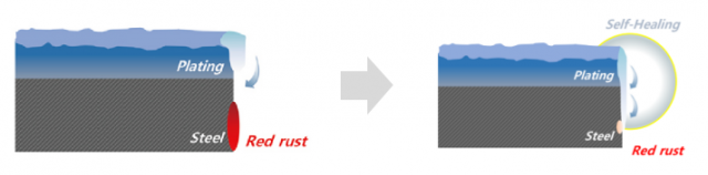 革新后的鍍鎂鋁鋅板在截面產(chǎn)生時,材料上部的鍍鋅層溶解并使截面被覆蓋,促進(jìn)穩(wěn)定的腐蝕生成物的生長。通過增加鍍層內(nèi)的Mg含量(%)及確保與Al含量(%)的最佳平衡,在促成切面部位優(yōu)越的的MgZn2腐蝕生成物增大的同時,也使其更加致密、堅(jiān)固,進(jìn)而加快耐腐蝕屏障(Self-Healing Zone)生成的速度,因此在自愈效果上與常用的高耐腐蝕鍍鋅鋼板相比,產(chǎn)生了明顯的差異。