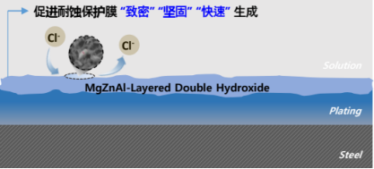 市面上普遍使用的鍍鋅材料,其耐蝕原理是在氧化過程中生成包含多個氣孔的飽和氧化皮膜層,隨著腐蝕因子(氧、水分、鹽分等)對氧化皮膜層的不斷侵蝕,表面鋅層厚度也不斷損耗,因此產(chǎn)品壽命受到極大影響。而這種革新性材料,其鍍層中的鎂(Mg)會促進(jìn)非常穩(wěn)定狀態(tài)的致密腐蝕生成物L(fēng)DH(Layered Double Hydroxide,層狀雙氫氧化物),再基于LDH形成全面的屏障并推遲腐蝕的發(fā)生,幾乎不發(fā)生損耗。