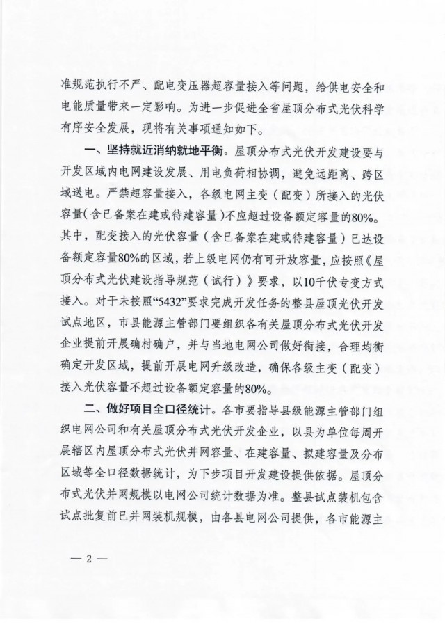 對于未按照“5432”要求完成開發(fā)任務(wù)的整縣屋頂光伏開發(fā)試點地區(qū),市縣能源主管部門要組織各有關(guān)屋頂分布式光伏開發(fā) 企業(yè)提前開展確村確戶,并與當(dāng)?shù)仉娋W(wǎng)公司做好銜接,合理均衡確定開發(fā)區(qū)域,提前開展電網(wǎng)升級改造,確保各級主變(配變)接入光伏容量不超過設(shè)備額定容量的80%。