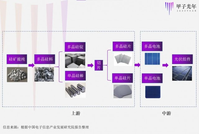 一個(gè)晶硅光伏組件的誕生,要經(jīng)歷硅料、硅片、電池片以及組件封裝四步:先將硅礦提純?yōu)槎嗑Ч枇?,再進(jìn)行鑄錠或拉晶,切片,產(chǎn)生多晶/單晶硅片,然后結(jié)合磷、硼等輔材,改變硅片的物理結(jié)構(gòu),使之可以發(fā)電,形成電池片,最后將電池片串聯(lián),添加玻璃、蓋板進(jìn)行封裝,即最終的組件產(chǎn)品。