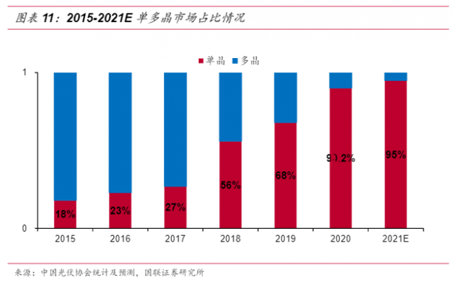 國聯(lián)證券研究所的數(shù)據(jù)顯示:2018年,單晶的市場份額占比達(dá)到了56%,到2021年則高達(dá)95%。五年間,單晶硅市場占比翻了5倍。
