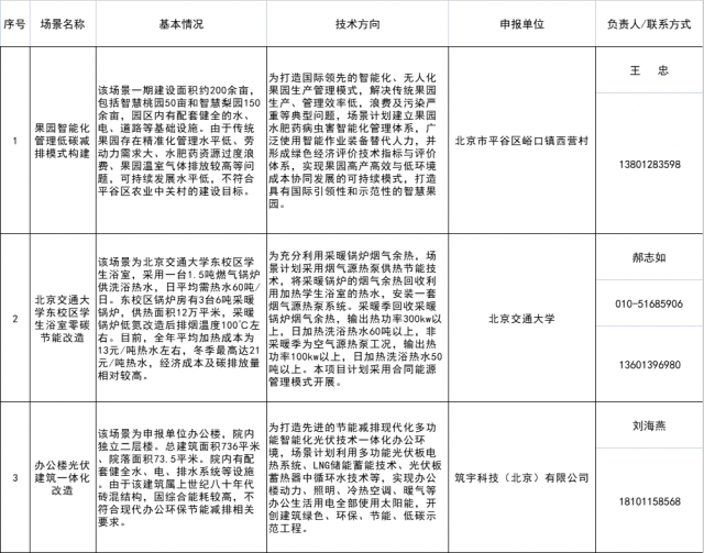 為推進(jìn)本市構(gòu)建市場(chǎng)導(dǎo)向的綠色技術(shù)創(chuàng)新體系工作,根據(jù)《北京市關(guān)于進(jìn)一步完善市場(chǎng)導(dǎo)向的綠色技術(shù)創(chuàng)新體系若干措施》(京發(fā)改〔2021〕1411號(hào),以下簡(jiǎn)稱(chēng)《若干措施》)、《北京市創(chuàng)新型綠色技術(shù)及示范應(yīng)用項(xiàng)目征集遴選管理細(xì)則》(京發(fā)改規(guī)〔2021〕9號(hào)),我們組織開(kāi)展了創(chuàng)新型綠色技術(shù)應(yīng)用場(chǎng)景征集工作。經(jīng)公開(kāi)征集、資料審核和現(xiàn)場(chǎng)調(diào)研,現(xiàn)發(fā)布第一批創(chuàng)新型綠色技術(shù)應(yīng)用場(chǎng)景。若有意愿在上述應(yīng)用場(chǎng)景開(kāi)展技術(shù)應(yīng)用的單位,可與應(yīng)用場(chǎng)景負(fù)責(zé)人聯(lián)系,自行溝通協(xié)商后續(xù)合作工作。后期,我們將持續(xù)跟蹤應(yīng)用場(chǎng)景技術(shù)應(yīng)用情況,并按照《若干措施》要求,對(duì)符合條件的技術(shù)應(yīng)用效果第三方評(píng)價(jià)進(jìn)行支持。
