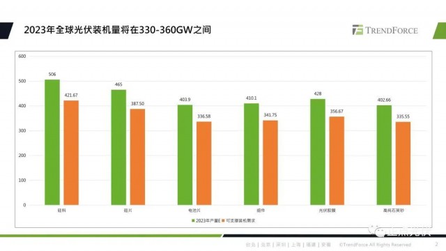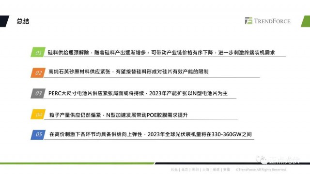 首先對產(chǎn)業(yè)鏈各環(huán)節(jié)2023年的市場量以及光伏裝機(jī)量進(jìn)行預(yù)估。從數(shù)據(jù)上看,2023年硅料整體供應(yīng)充足,不再是制約產(chǎn)業(yè)發(fā)展的瓶頸環(huán)節(jié)。硅片端因?yàn)楦呒兪⑸暗墓?yīng)偏緊,從而造成了坩鍋產(chǎn)出的受限,這也將影響到硅片的實(shí)際產(chǎn)出。電池片環(huán)節(jié)因?yàn)?022年下半年以來,新建產(chǎn)能主要還是以n型技術(shù)為主,新技術(shù)產(chǎn)能釋放具有較大不確定性。PERC的產(chǎn)能擴(kuò)張?zhí)幱谕顟B(tài),2023年大尺寸PERC電池片或?qū)⒊霈F(xiàn)供需緊平衡的狀態(tài)。主要還是關(guān)注TOPCon電池片的實(shí)際產(chǎn)出。膠膜方面,poe粒子目前主要還是依賴進(jìn)口,隨著n型需求的提升,poe粒子的供應(yīng)端也會(huì)較為緊張。但是以上各環(huán)節(jié)在較高的資金刺激下,實(shí)際產(chǎn)出都具備了向上的彈性。所以綜合的產(chǎn)業(yè)鏈的實(shí)際產(chǎn)出數(shù)據(jù),我們預(yù)計(jì)2023年全球裝機(jī)量將在330-360GW之間。