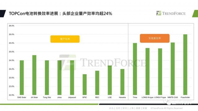 當(dāng)前,TOPCon頭部企業(yè)的量產(chǎn)效率都突破了24%,比PERC平均要高0.5%-0.8%,2023年的量產(chǎn)效率也有望朝著24.5%-25%邁進(jìn)。TOPCon的實(shí)驗(yàn)室轉(zhuǎn)換效率目前都超過了25%,今年的四月份晶科公布了182版型的n型TOPCon電池片的轉(zhuǎn)換效率,已經(jīng)達(dá)到了25.7%,打破新的記錄。