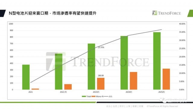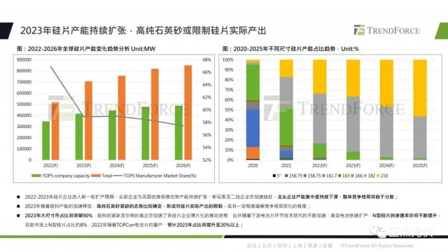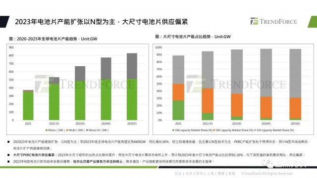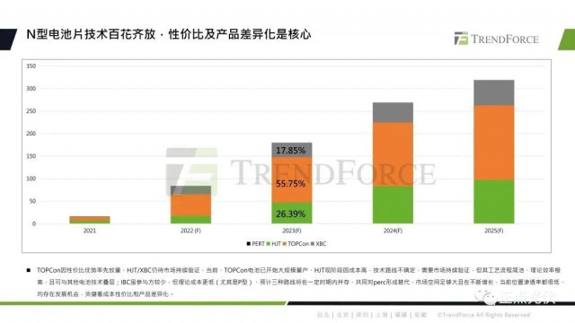 TOPCon因?yàn)樗男詢r(jià)比優(yōu)勢,實(shí)現(xiàn)了率先放量。預(yù)計(jì)到2023年底,N型電池片的產(chǎn)能將達(dá)到180GW,占比約為25.7%。