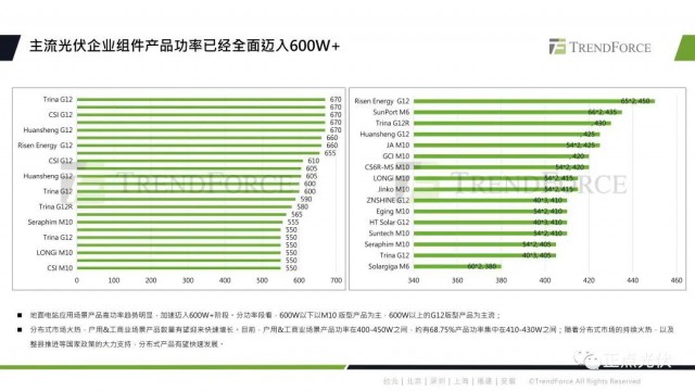 目前主流光伏企業(yè)組件產(chǎn)品功率已全面邁入了600W+,分功率段來看,600W以下以M10版型產(chǎn)品為主,600W以上的主要以G12版型產(chǎn)品為主。產(chǎn)品數(shù)量有望快速增長,目前來看,戶用及工商業(yè)場景產(chǎn)品功率大多在400到450W之間。隨著分布式市場的持續(xù)火熱,和整縣推進(jìn)國家政策的大力支持,分布式產(chǎn)品有望快速發(fā)展。
