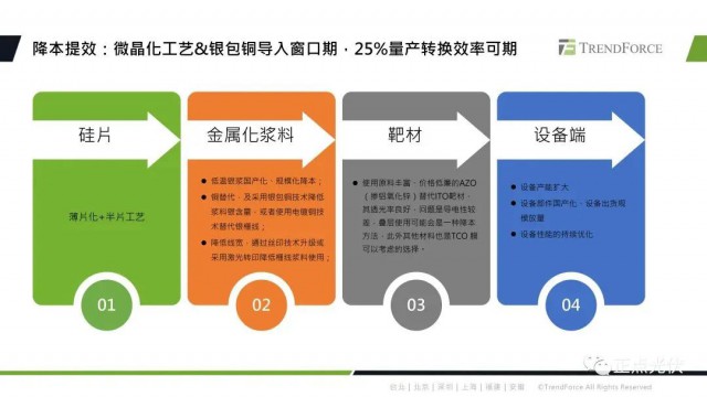 目前HJT技術(shù)降本增效的路徑還是比較確定的,硅片端主要是薄片化以及半片工藝的發(fā)展,金屬化漿料方面,包括低溫銀漿的國產(chǎn)化、規(guī)?;当?銀包銅、電鍍銅上降低銀漿的耗量,靶材價(jià)格以及用量的下降,還有設(shè)備國產(chǎn)化、規(guī)模化降本等方面。