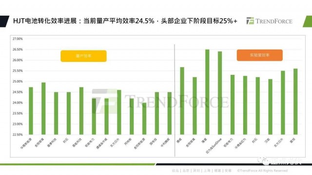 再來具體看一下HJT技術(shù)產(chǎn)能進(jìn)展及效率方面。目前HJT技術(shù)發(fā)展進(jìn)入瓶頸期,全球企業(yè)宣告的已建成產(chǎn)能為11.6GW。雖然規(guī)劃的產(chǎn)能比較多,但是待建的產(chǎn)能還是比較少的。核心原因還是因?yàn)楫?dāng)前HJT的生產(chǎn)成本相對較高,與PERC量產(chǎn)效率并未顯出更高水平,產(chǎn)品溢價(jià)有限。