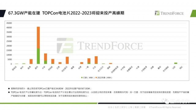 具體來看TOPCon技術(shù)的產(chǎn)能進(jìn)展與效率方面。據(jù)統(tǒng)計(jì),截止到目前,TOPCon的已建產(chǎn)能大約是在34.8GW,2022年再建產(chǎn)能約為67.3GW。從目前公布的項(xiàng)目來看,規(guī)模還是十分可觀的。目前TOPCon電池的擴(kuò)產(chǎn)還是以存量玩家為主,儲(chǔ)備項(xiàng)目前期投產(chǎn)的量產(chǎn)數(shù)據(jù)會(huì)比較關(guān)鍵,如果良率方面的問題可以得到有效的改善,后期項(xiàng)目的推進(jìn)將會(huì)更有信心。