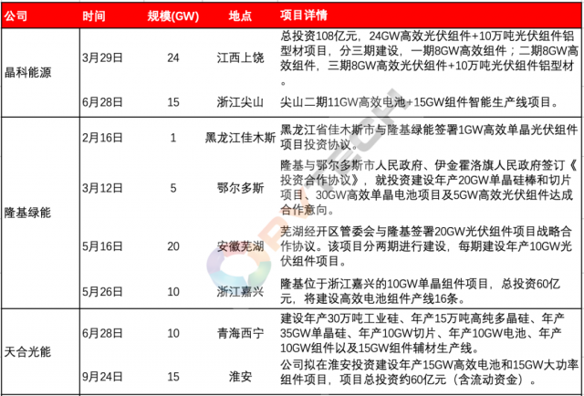 今年以來,以晶科能源、隆基綠能、天合光能、晶澳科技等為代表的行業(yè)第一梯隊(duì)主流組件大廠為鞏固各自市場(chǎng)地位、把握行業(yè)發(fā)展帶來的市場(chǎng)機(jī)遇,均在積極投資新建組件產(chǎn)能。