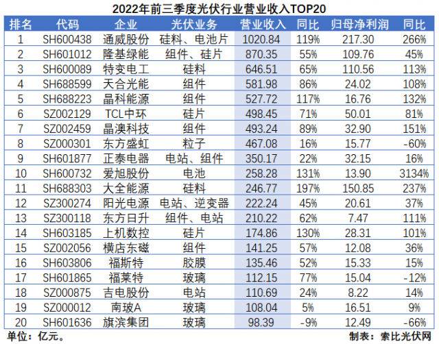 從營(yíng)收規(guī)模來(lái)看,硅料和組件依然是創(chuàng)收能力最強(qiáng)的環(huán)節(jié)。而且,多數(shù)企業(yè)前三季度營(yíng)業(yè)收入均已超過2021年全年,且創(chuàng)歷史新高。其中,通威股份營(yíng)收規(guī)模首次突破千億大關(guān),達(dá)到1021億元;隆基綠能二、三季度邊際改善顯著,環(huán)比增速分別達(dá)到71%和15%,營(yíng)收規(guī)模達(dá)到870.35億元;特變電工受益于硅料、煤炭產(chǎn)品的“量?jī)r(jià)齊升”,達(dá)到646.51億元。