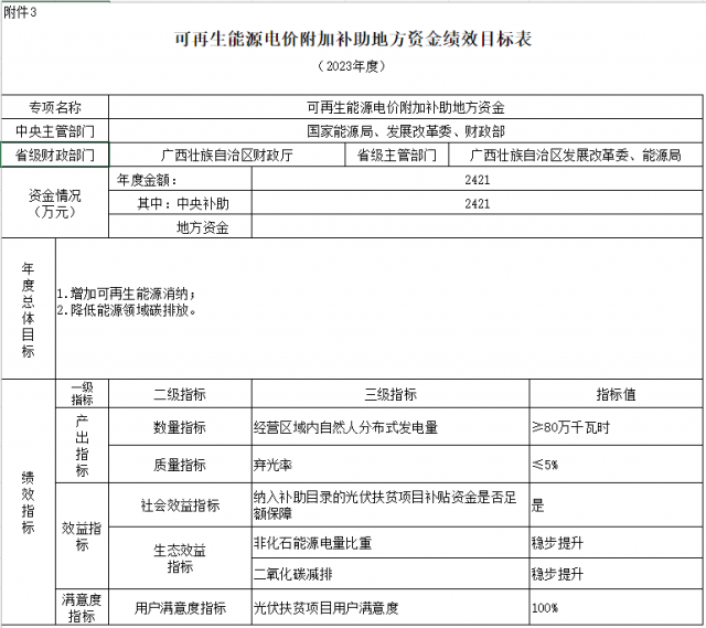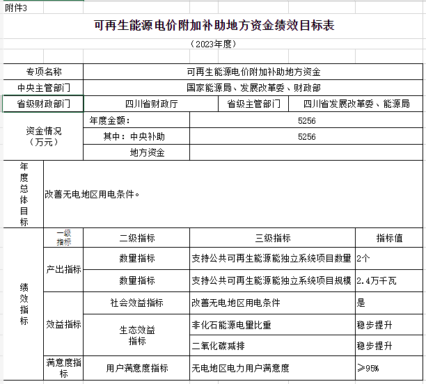 四、為保障資金安全,提高資金使用效率,電網(wǎng)企業(yè)應(yīng)按年度對補貼資金申請使用等情況進行全面核查,必要時可聘請獨立第三方。為深入貫徹落實《中共中央 國務(wù)院關(guān)于全面實施預(yù)算績效管理的意見》,切實提高財政資金使用效益,請你單位在組織預(yù)算執(zhí)行中對照績效目標(附件3)做好績效監(jiān)控,確保年度績效目標如期實現(xiàn)。同時,你單位應(yīng)按規(guī)定及時上報績效自評結(jié)果,績效自評結(jié)果將作為分配預(yù)算資金的重要依據(jù)。