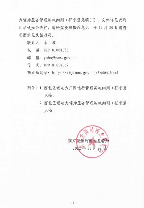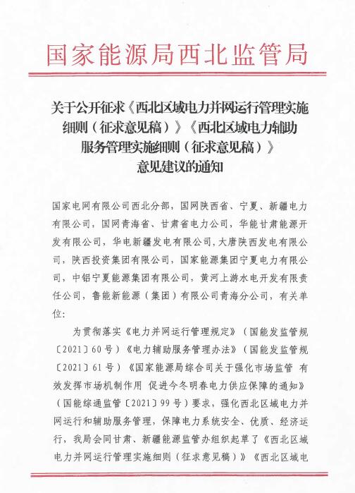 12月1日,國家能源局西北監(jiān)管局公開征求《西北區(qū)域電力并網(wǎng)運行管理實施細則(征求意見稿)》《西北區(qū)域電力輔助服務管理實施細則(征求意見稿)》意見建議的通知。