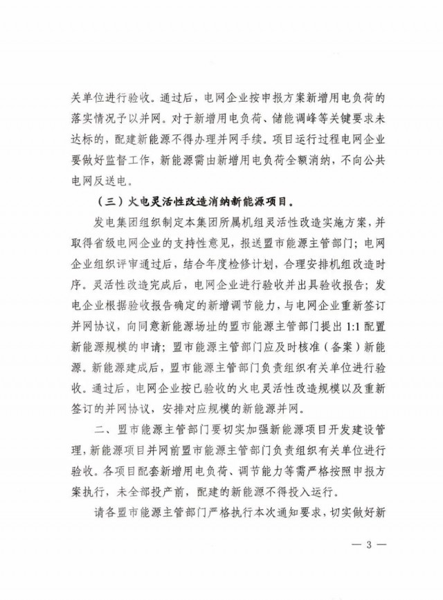 發(fā)電集團組織制定本集團所屬機組靈活性改造實施方案,并取得省級電網(wǎng)企業(yè)的支持性意見,報送盟市能源主管部門:電網(wǎng)企業(yè)組織評審通過后,結合年度檢修計劃,合理安排機組改造時序。靈活性改造完成后,電網(wǎng)企業(yè)進行驗收并出具驗收報告:發(fā)電企業(yè)根據(jù)驗收報告確定的新增調(diào)節(jié)能力,與電網(wǎng)企業(yè)重新簽訂并網(wǎng)協(xié)議,向同意新能源場址的盟市能源主管部門提出 1:1 配置新能源規(guī)模的申請;盟市能源主管部門應及時核準(備案)新能源。新能源建成后,盟市能源主管部門負責組織有關單位進行驗收。通過后,電網(wǎng)企業(yè)按已驗收的火電靈活性改造規(guī)模以及重新簽訂的并網(wǎng)協(xié)議,安排對應規(guī)模的新能源并網(wǎng)。