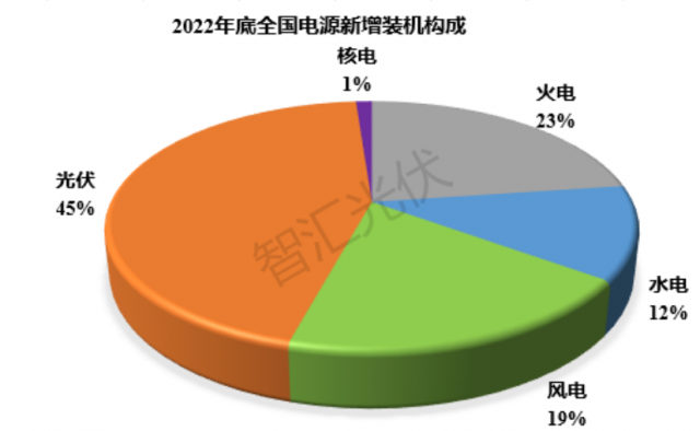 2022年,全國水電、火電、核電、風(fēng)電、光伏的裝機容量分別新增2387萬千瓦、4471萬千瓦、227萬千瓦、3763萬千瓦和8741萬千瓦,合計19974萬千瓦。2022年,各類電源新增裝機結(jié)構(gòu)如下圖所示。