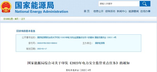 1月30日,國家能源局發(fā)布通知,印發(fā)《2023年電力安全監(jiān)管重點任務》(簡稱《任務》)。