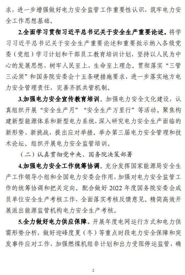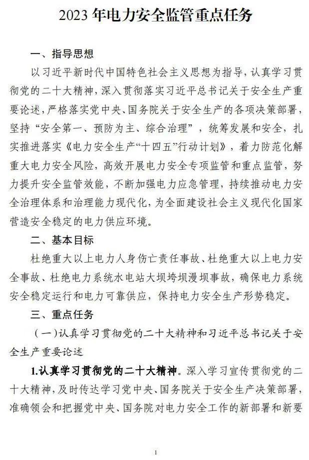 為貫徹落實黨的二十大精神,扎實做好2023年電力安全監(jiān)管工作,確保電力系統(tǒng)安全穩(wěn)定運行和電力可靠供應,推動全國電力安全生產(chǎn)形勢持續(xù)穩(wěn)定向好,我局制定了《2023年電力安全監(jiān)管重點任務》?,F(xiàn)印發(fā)給你們,請結合本地區(qū)、本單位實際,認真貫徹落實。