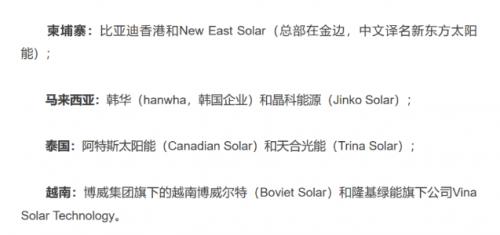 結(jié)果發(fā)現(xiàn)有5家公司試圖規(guī)避關(guān)稅,它們分別是:比亞迪、隆基綠能、阿特斯太陽(yáng)能、天合光能和新東方太陽(yáng)能,其業(yè)務(wù)部門(mén)都被認(rèn)定違反了反傾銷(xiāo)和反補(bǔ)貼稅法律,必須支付高額關(guān)稅。而主要的組件供應(yīng)商韓華、晶科、博維等沒(méi)有違反法律。