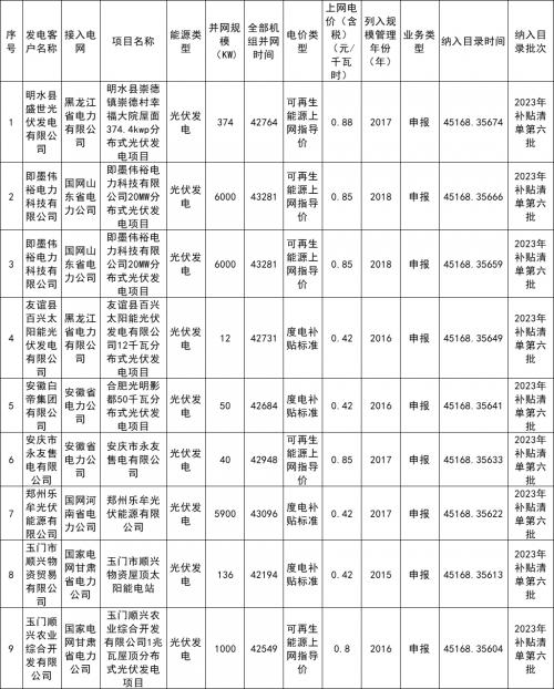2023年第六批可再生能源發(fā)電補貼項目清單公布