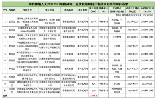本次納入天津市2023年風(fēng)電、光伏發(fā)電項(xiàng)目共計(jì)10個(gè),規(guī)??傆?jì)2384.1MW,其中,風(fēng)電項(xiàng)目7個(gè),規(guī)模總計(jì)1528.1MW;光伏項(xiàng)目3個(gè),規(guī)??傆?jì)856MW。