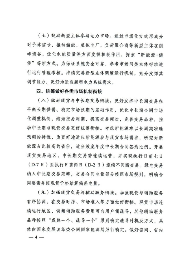 加強現(xiàn)貨交易與輔助服務銜接。加強現(xiàn)貨與輔助服務有序協(xié)調,在交易時序、市場準入等方面做好銜接?,F(xiàn)貨市場連續(xù)運行地區(qū),調頻輔助服務費用可向用戶側疏導,其他輔助服務品種按照“成熟一個、疏導一個”原則確定疏導時機及方式,具體由國家發(fā)展改革委會同國家能源局另行確定。做好省間、省內現(xiàn)貨市場與區(qū)域輔助服務市場的銜接融合,提升電力資源優(yōu)化配置效率。