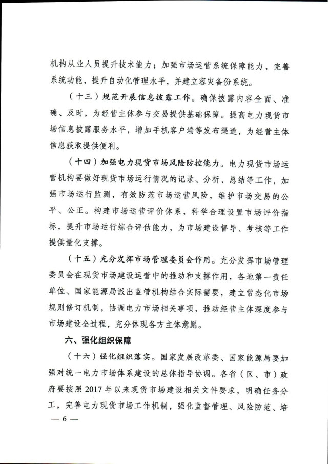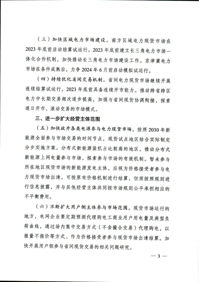 通知提出,加快放開各類電源參與電力現(xiàn)貨市場。按照2030年新能源全面參與市場交易的時間節(jié)點,現(xiàn)貨試點地區(qū)結合實際制定分步實施方案。分布式新能源裝機占比較高的地區(qū),推動分布式新能源上網(wǎng)電量參與市場,探索參與市場的有效機制。暫未參與所在地區(qū)現(xiàn)貨市場的新能源發(fā)電主體,應視為價格接受者參與電力現(xiàn)貨市場出清,可按原有價格機制進行結算,但須按照規(guī)則進行信息披露,并與其他經營主體共同按市場規(guī)則公平承擔相應的不平衡費用。