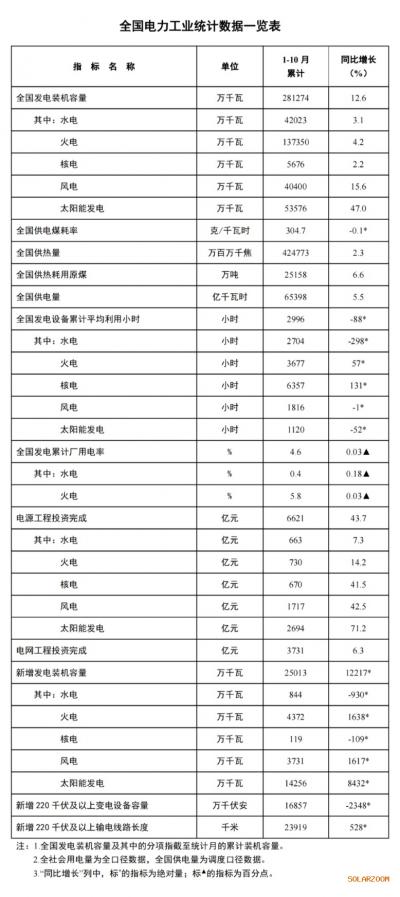 截至10月底,全國(guó)累計(jì)發(fā)電裝機(jī)容量約28.1億千瓦,同比增長(zhǎng)12.6%。其中,太陽(yáng)能發(fā)電裝機(jī)容量約5.4億千瓦,同比增長(zhǎng)47.0%;風(fēng)電裝機(jī)容量約4.0億千瓦,同比增長(zhǎng)15.6%。