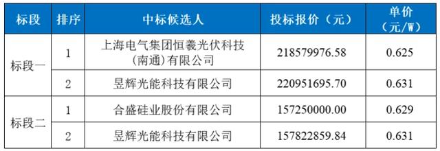 剩余5家企業(yè)報(bào)價(jià)則明顯低于光伏協(xié)會(huì)發(fā)布的組件成本價(jià),報(bào)價(jià)范圍在0.6245元/W—0.6313元/W。上述采購項(xiàng)目?jī)蓚€(gè)標(biāo)段的中標(biāo)候選人包括上海電氣集團(tuán)恒羲光伏科技(南通)有限公司、昱輝光能科技有限公司以及合盛硅業(yè)。
