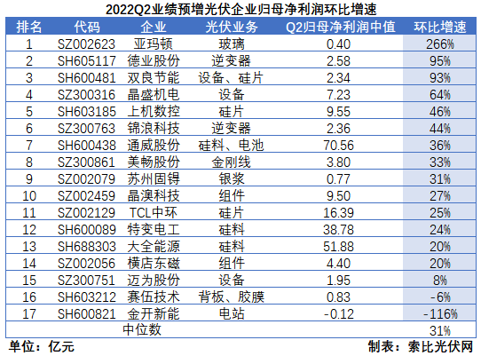 截至7月15日,兩市共有29家光伏企業(yè)發(fā)布2022年半年度業(yè)績(jī)預(yù)告。其中,預(yù)增企業(yè)17家,扭虧企業(yè)5家,預(yù)減企業(yè)3家,預(yù)虧企業(yè)4家。硅料、硅片以及設(shè)備企業(yè)業(yè)績(jī)?cè)鏊倬忧埃芄枇蟽r(jià)格暴漲影響較大的專業(yè)化電池及組件企業(yè)經(jīng)營(yíng)業(yè)績(jī)則出現(xiàn)顯著分化。