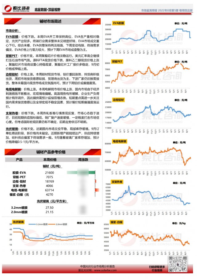 光伏產(chǎn)業(yè)周監(jiān)測報告系索比咨詢對于光伏產(chǎn)業(yè)鏈上下游價格的監(jiān)測與預(yù)報,幫助企業(yè)獲得最實時的參考價格。每周除了對硅料、硅片、電池片、組件、輔材等價格進(jìn)行追蹤和分析外,亦關(guān)注下游招標(biāo)動態(tài),并對后續(xù)市場趨勢做出研判。