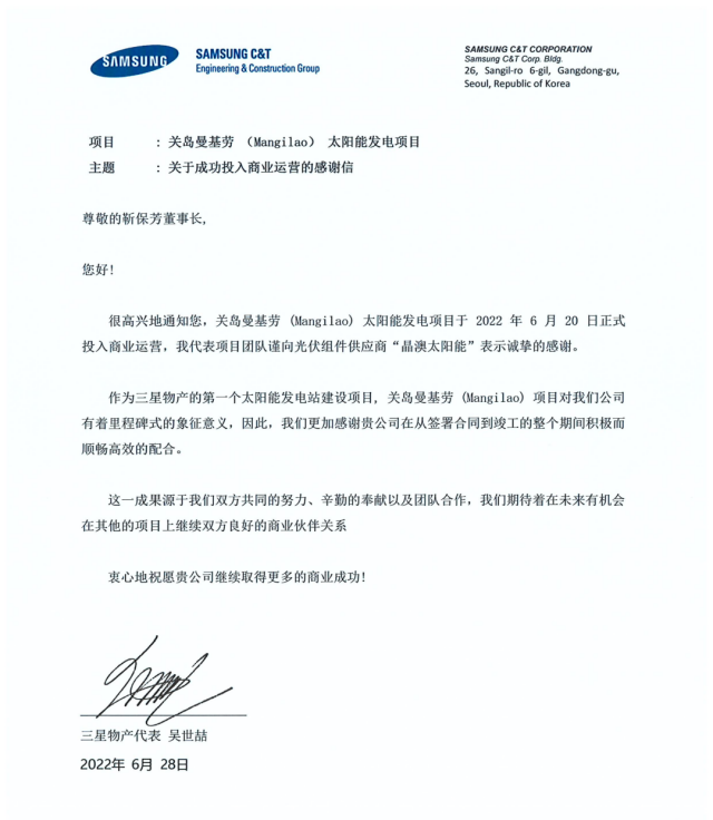 為表示對晶澳在項目建設(shè)過程中的大力支持以及對晶澳高品質(zhì)產(chǎn)品的贊賞和感謝,三星物產(chǎn)在項目建成后特寄來感謝信,以表謝意。三星物產(chǎn)在感謝信中寫道:“作為三星物產(chǎn)的第一個太陽能發(fā)電站建設(shè)項目,關(guān)島曼基勞項目對我們公司有著里程碑式的象征意義,因此,我們更加感謝貴公司在從簽署合同到竣工的整個期間積極而順暢高效的配合。”