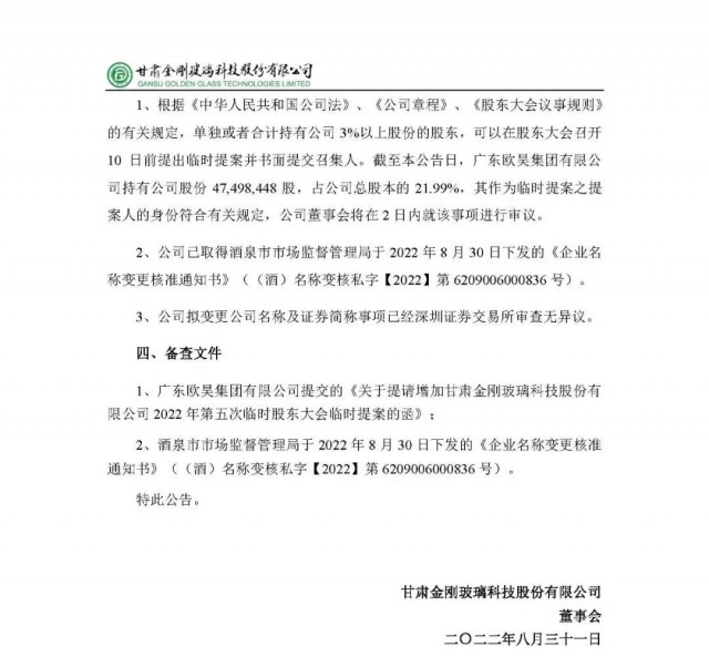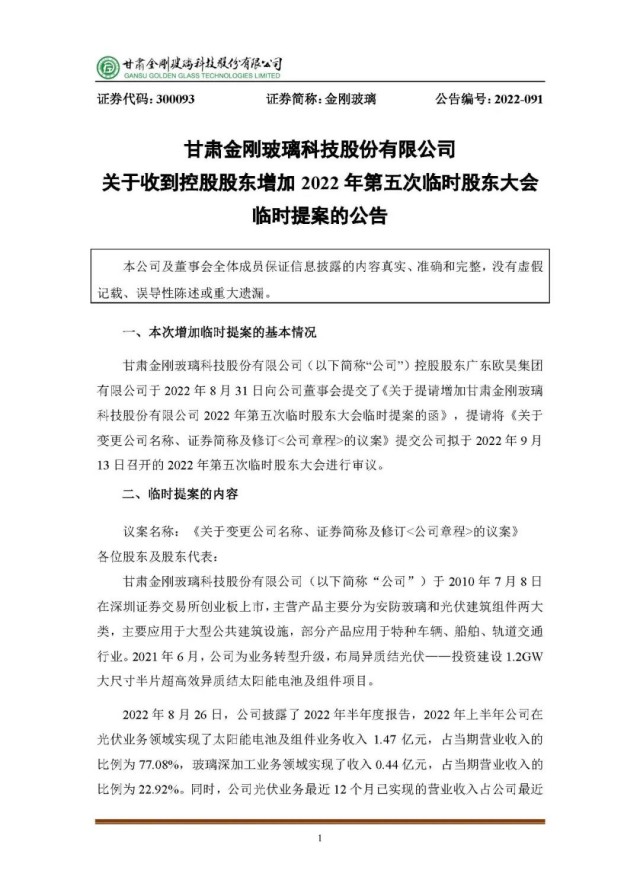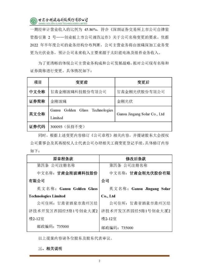 為了更清晰的體現(xiàn)公司主營業(yè)務(wù)構(gòu)成和公司發(fā)展戰(zhàn)略,擬對公司現(xiàn)有名稱和證券簡稱進(jìn)行變更。上市公司名稱由“甘肅金剛玻璃科技股份有限公司”變更為“甘肅金剛光伏股份有限公司”,證券簡稱由“金剛玻璃”改為“金剛光伏”,英文全稱由“Gansu Golden Glass Technologies Limited”改為“Gansu Jingang Solar Co., Ltd”。公司董事會將在兩日內(nèi)就該事項(xiàng)進(jìn)行審議。