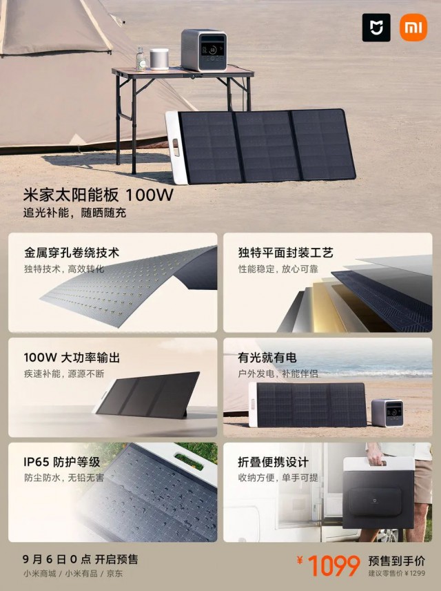 9月6日,小米智能生態(tài)微博官方宣布,米家太陽(yáng)能板100W開(kāi)啟定金預(yù)售,建議零售價(jià)1299元,預(yù)售到手價(jià)1099元。