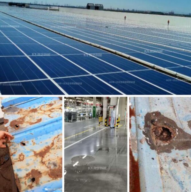 若只依靠彩鋼瓦本身的屋面,很容易因?yàn)橥繉雍穸炔粔颍又贤饩€、雨水、光合作用等自然因素的侵蝕,造成屋面彩鋼瓦接縫處開裂、鉚釘松動(dòng)生銹、屋面銹蝕擴(kuò)大、瓦脊銹蝕銹穿導(dǎo)致屋面出現(xiàn)滲水漏水的情況。同時(shí)因其坡度小,可能會(huì)造成雨水排泄不暢、積水超過彩鋼瓦接縫高度或鉚釘孔高度及溝沿瓦而導(dǎo)致銹損滲漏。而工廠生產(chǎn)過程中排放的酸性、堿性等氣體長期與屋面接觸,也會(huì)腐蝕鋼結(jié)構(gòu),加速銹蝕、穿孔導(dǎo)致滲漏。