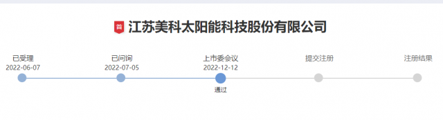 12月12日,據(jù)創(chuàng)業(yè)板上市委員會2022年第85次審議會議結(jié)果公告,江蘇美科太陽能科技股份有限公司(以下簡稱“美科股份”)首發(fā)上市獲得通過,成為2022年過會的第399家企業(yè)。