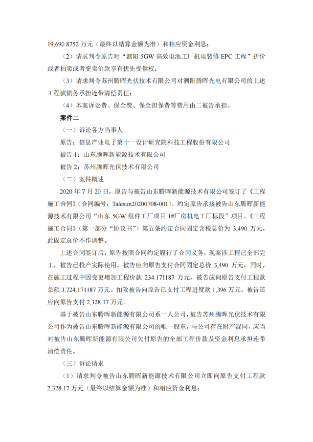 2020年~2021年期,十一科技與蘇州騰暉的六家全資子公司泗陽騰暉光電有限公司、山東騰暉新能源技術(shù)有限公司、沛縣騰暉新能源技術(shù)有限公司、宿遷騰暉新能源技術(shù)有限公司、山東騰暉光電有限公司、泗陽騰暉新能源技術(shù)有限公司簽訂了多筆項目施工承包合同,但上述六家企業(yè)并未全部付清工程款。