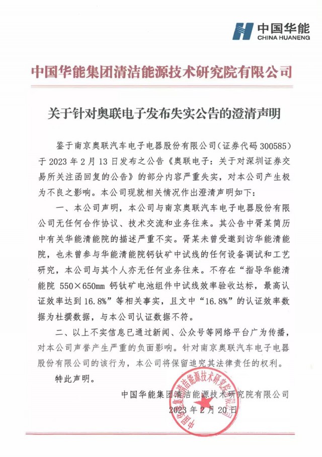 華能清潔能源研究院發(fā)布針對奧聯(lián)電子發(fā)布失實公告的澄清聲明,公司聲明,公司與南京奧聯(lián)汽車電子電器股份有限公司無任何合作協(xié)議、技術(shù)交流和業(yè)務(wù)往來。