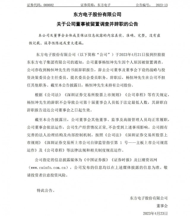東方電子集團(tuán)所屬上市公司東方電子4月23日晚間公告稱,公司董事楊恒坤先生因個(gè)人原因被留置調(diào)查。