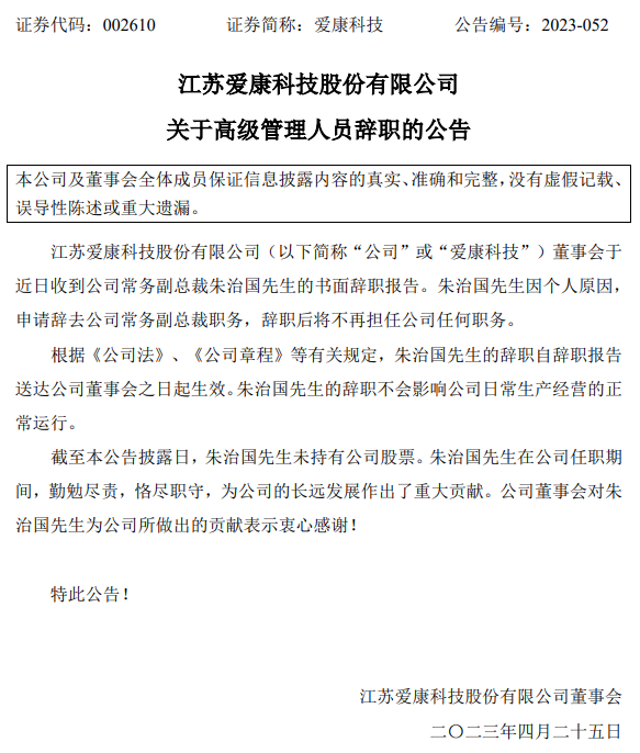 4月24日,愛康科技(002610.SZ)發(fā)布公告稱:董事會于近日收到公司常務副總裁朱治國先生的書面辭職報告。朱治國先生因個人原因,申請辭去公司常務副總裁職務,辭職后將不再擔任公司任何職務。