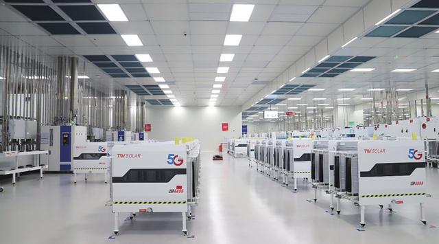 此外,通威還打造全球光伏行業(yè)首個(gè)5G智慧園區(qū)——通威太陽能成都金堂基地?;貎?nèi)擁有11個(gè)足球場(chǎng)大小的無塵車間,32條全自動(dòng)智能制造生產(chǎn)線高效運(yùn)轉(zhuǎn),數(shù)百臺(tái)智能小車來回穿梭運(yùn)送物料,經(jīng)過制絨、擴(kuò)散、SE激光摻雜等10道工序,每天生產(chǎn)500多萬片太陽能電池片。這里的智能制造生產(chǎn)線,與同等產(chǎn)能的傳統(tǒng)太陽能電池片生產(chǎn)線相比,用工減少約62%,能源消耗降低約30%,生產(chǎn)效率提升約161%。