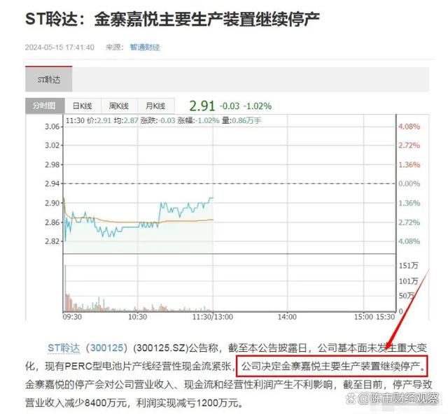 據(jù)業(yè)內(nèi)消息顯示,ST聆達股份(300125)日前發(fā)布公告,稱由于公司基本面未發(fā)生重大變化,現(xiàn)有PERC型電池片產(chǎn)線經(jīng)營性現(xiàn)金流緊張。基于此,聆達股份宣布旗下的光伏制造工廠-金寨嘉悅繼續(xù)保持停產(chǎn)狀態(tài),但具體的復(fù)工時間并未確定。值得一提的是,今年2月份,金寨嘉悅就因為市場等因素而宣布于3月5日開始放假,并預(yù)計今年6月1日復(fù)工。然而,在預(yù)計的復(fù)工日期臨近之際,金寨嘉悅被宣布繼續(xù)停產(chǎn)。業(yè)內(nèi)人士認(rèn)為,此次宣布繼續(xù)放假,預(yù)示著這家光伏大廠正面臨前所未有的困難,短期內(nèi)復(fù)工或是無望。