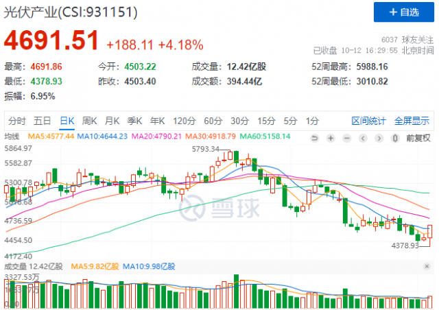 10月12日,早盤全線跳水的光伏板塊午后“遭”暴力拉升,中證光伏產(chǎn)業(yè)指數(shù)(CSI:931151)大漲4.18%,全日振幅高達6.95%,個股紛紛走出“金針探底”形態(tài)。