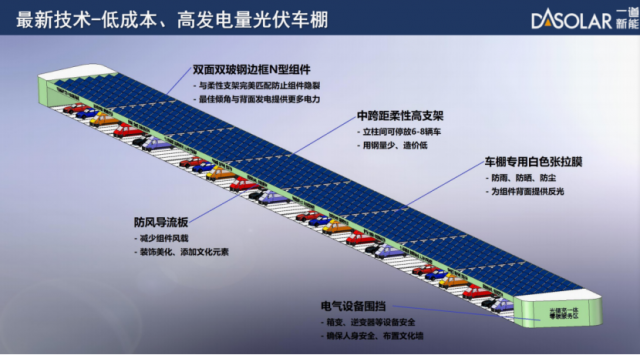在第六屆分布式能源嘉年華上,一道新能源系統(tǒng)工程創(chuàng)新研究院院長(zhǎng)韓利生分享了零碳服務(wù)區(qū)的光儲(chǔ)充一體化停車場(chǎng)解決方案。他表示一道新能推出的停車區(qū)光伏解決方案,以高效、美觀、便捷為理念,對(duì)于常規(guī)停車棚造價(jià)高、發(fā)電量低、設(shè)計(jì)感缺失等缺點(diǎn)進(jìn)行了針對(duì)性優(yōu)化。首先,采用中跨距柔性高支架代替常規(guī)短跨距鋼架式結(jié)構(gòu),降低了造價(jià),同時(shí)為N型雙面鋼邊框組件提供最佳傾角,確保整面發(fā)電量最優(yōu);其次,布置白色張拉膜作為防曬防雨材料,并利用其反光特性,增加雙面組件的背面發(fā)電量;最后,采用防風(fēng)導(dǎo)流板、安全隔離護(hù)板等結(jié)構(gòu),將光伏組件迎風(fēng)面和地面電氣設(shè)備保護(hù)起來,既提高了安全性、又增加了美觀性。
