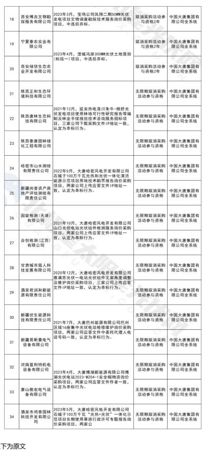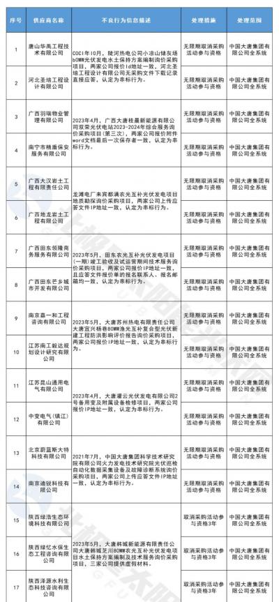 根據(jù)統(tǒng)計(jì),共有34個(gè)光伏相關(guān)企業(yè),17個(gè)光伏項(xiàng)目不良行為被大唐集團(tuán)處理,通知表示,相關(guān)供應(yīng)商可在上述處理期結(jié)束前1個(gè)月,向招標(biāo)人提出整改驗(yàn)收申請(qǐng),經(jīng)相關(guān)單位或部門驗(yàn)收合格后方能解除處理。